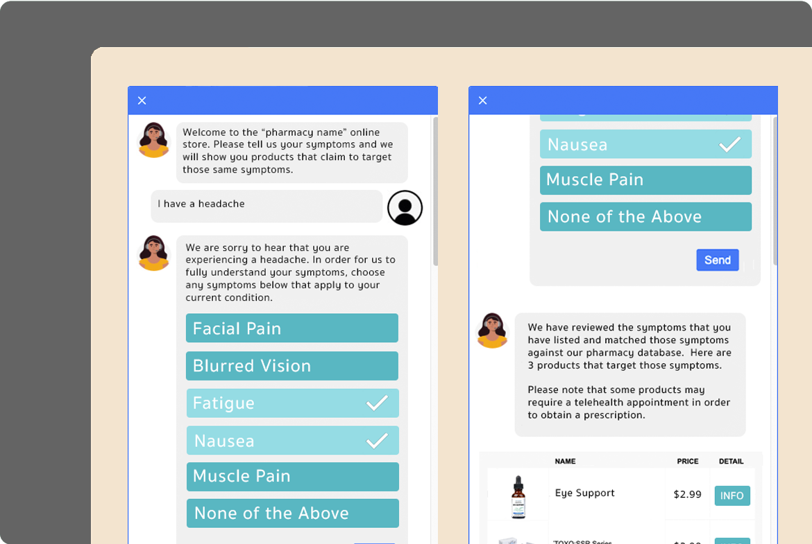 Read more: The Art of ConnectionPatients often struggle to determine which medications treat their symptoms. To address this, we have developed a symptom analysis tool that matches a pharmacy’s products to the symptoms entered by the patient. Based on the results, patients can either purchase the recommended product directly from the site or schedule an appointment with a telehealth provider if a prescription is needed.